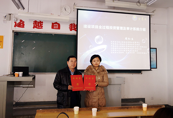 2014年12月16日上午,我公司董事長(zhǎng)周和生先生向內(nèi)蒙古建筑職業(yè)技術(shù)學(xué)院工程管理學(xué)院捐贈(zèng)“建設(shè)項(xiàng)目全過(guò)程投資管理及審計(jì)系統(tǒng)”軟件,并向?qū)W院師生們講授“建設(shè)項(xiàng)目投資管理及審計(jì)信息化”課程,大力支持學(xué)校教學(xué)工作。